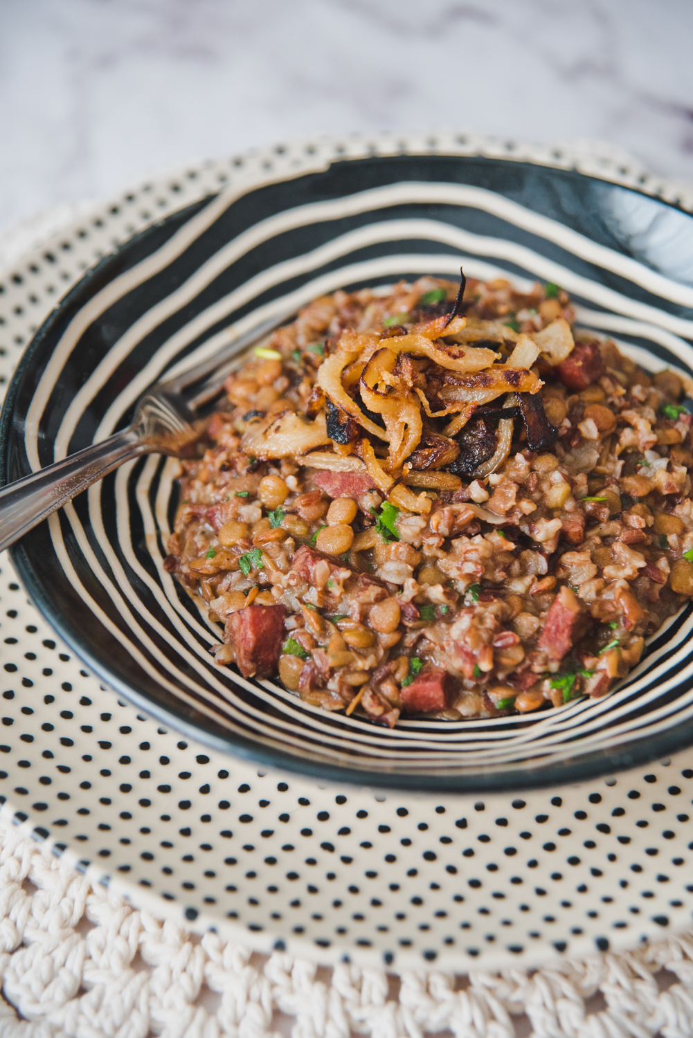 Ferva 1 litro de água. Enquanto isto, leve uma panela de pressão ao fogo médio-alto, coloque um fio de óleo, a folha de louro e refogue a cebola até que fique bem tostada. Não é para caramelizar em fogo baixo, é para deixar bem dourada e queimadinha nas pontas. Reserve metade da cebola para finalizar o preparo. Junte na panela o paio e deixe dourar, depois adicione o alho, o arroz, a lentilha e o cominho, e refogue até que os grãos fiquem bem fritos. Tempere com sal e pimenta, baixe o fogo, junte a água fervente e cozinhe por 5 minutos depois que começar a chiar. Deixe o ar sair naturalmente, misture as ervas picadas e sirva o arroz com o restante da cebola tostada por cima. Este arroz com lentilha fica mais grudadinho e cremoso que o feito com arroz branco ou agulhinha integral na panela comum.